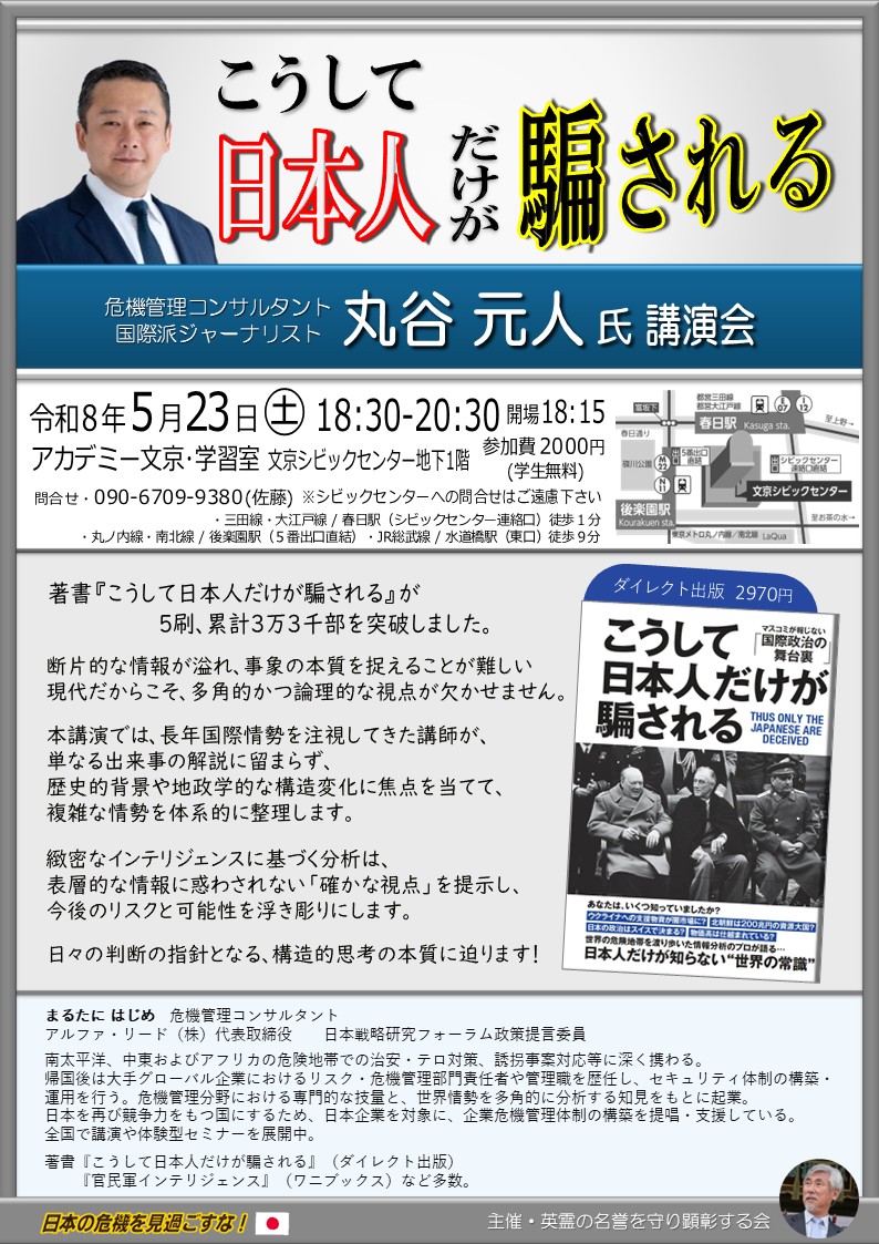 5月23日(土)【英霊の名誉を守り顕彰する会】『こうして日本人だけが騙される』丸谷元人講演会