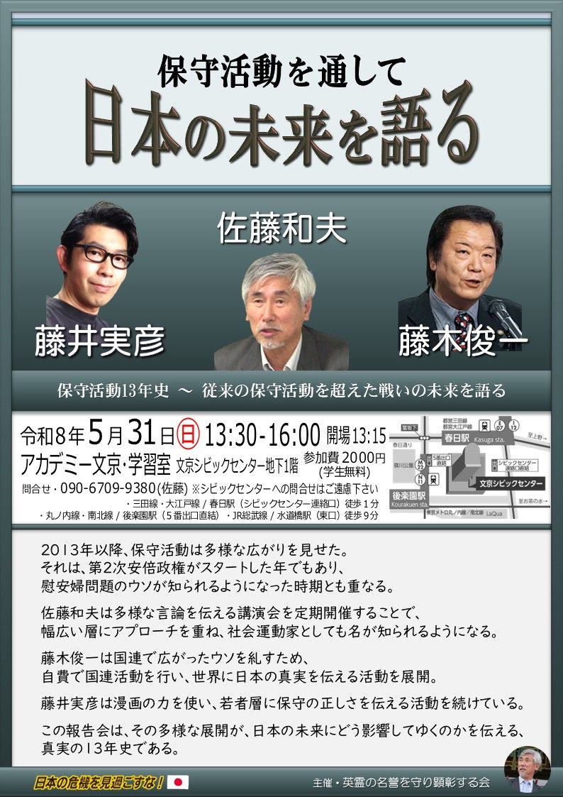 5月31日(日)【英霊の名誉を守り顕彰する会】保守活動を通して日本の未来を語る