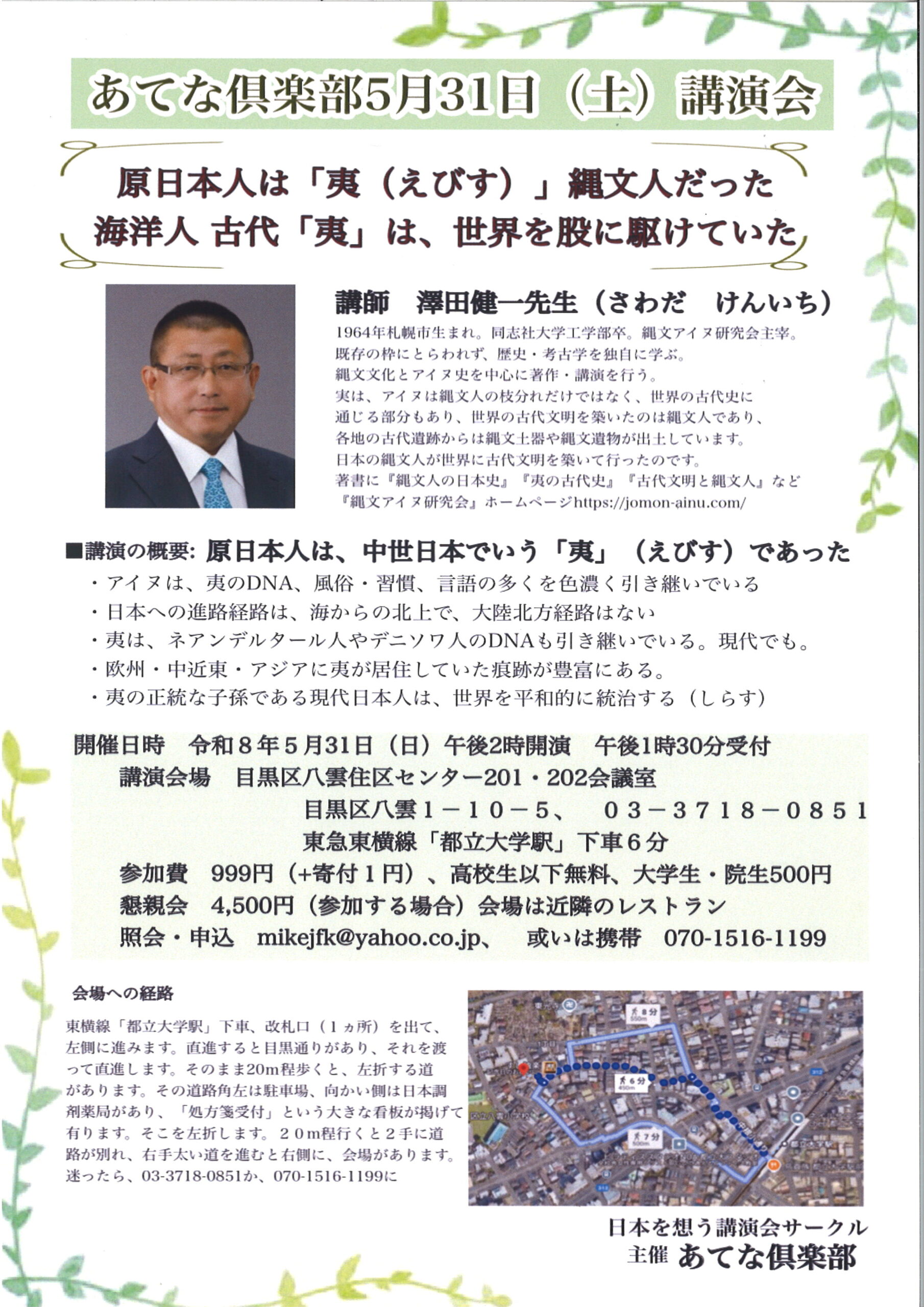 5月31日(日)【あてな倶楽部】現日本人は「夷(えびす)」縄文人だった 海洋人 古代「夷」は世界を股に駆けていた